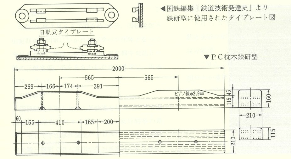 ちなみに日本国有鉄道発行の“鉄道技術発達史"によると、国鉄で初めて採用したPC(プレキャストコンクリート)枕木鉄研型に渡辺式タイプレートが使用されている(下図)。