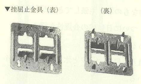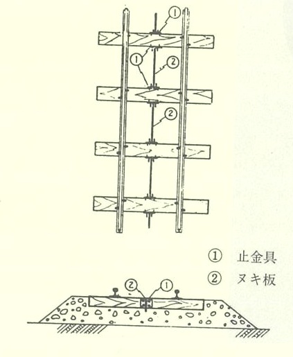 この点に着目して、軌道の横方向の砂利抵抗を倍加させる安価な挫屈止装置を考案したのである。枕木の軌間中央部側面にこの止金真を打ちつけ、その金具の溝部へ枕木純間隔の長さで、厚さ2寸(6.6 cm)深さ5寸の木板(ヌキ)をさし込む。