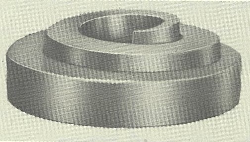 国鉄では、 コンクリート道床へのレール締結用クリップは、板ばねを使用したフランス式と剛性クリップにスプリングワッシャーを併用したドイツ式とに分かれていた。当社がこの時代に使用していたのは剛性クリップとスプリングワッシャーを使用したドイツ式であったが、昭和33年に至って渡辺社長は、剛性クリップの性能をさらに上まわるV (Volute)ばね(円錐渦巻ばね)の開発に成功した。この製品は、渦巻型の各コイルの厚さを変えることでバネに加わる力とたわみ量が一定比率になるように設計された“竹の子ばね"であった。
