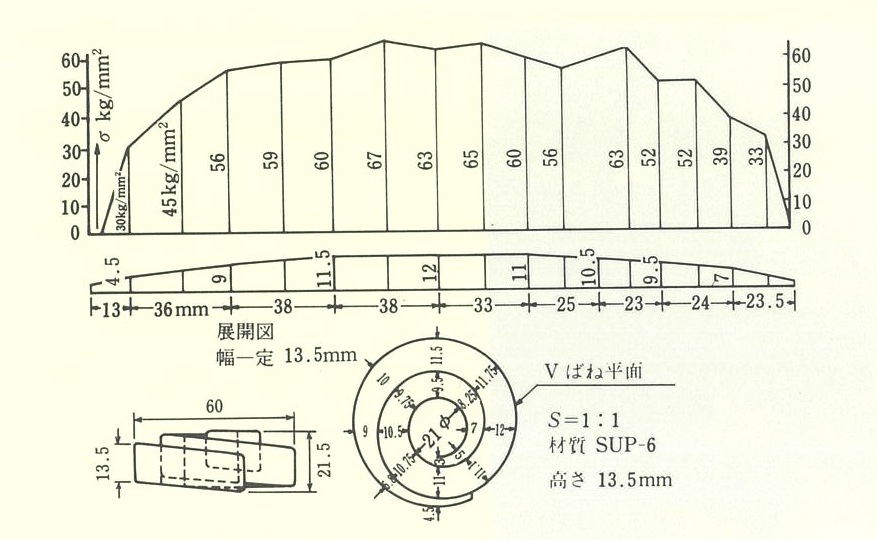 しかも、内径と外径がほぼ円形に形成されるため強大な圧縮力に耐え衝撃力の吸収消散効率が高い上、材料費の節約と製造が容易という実用的特徴ももっていた。このVばねの開発により各種レールの弾性締結が容易となり、後のV型タイプレート、連接軌道、NS短枕木(NS短ブロック)の締結等コンクリート道床工事伸長の鍵となったことは特筆すべきだろう 。