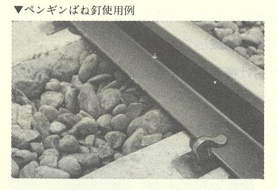 一方、昭和41年に至り、コンクリートまくらぎの締結用として試作実験を重ねていた“新しいばね釘"の開発に成功。支持力、抜き取り、 たわみ量、横圧抵抗、 互換性等で従来の犬釘より優れたこのばね釘はその形状がペンギンに似ていることから「ペンギンばね釘」と命名された。