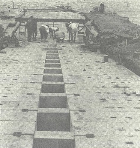 水中にプロックを敷設するためにわざわざ静岡から潜水夫 を雇い、軌框をドラム缶で浮かせておいてから徐々に沈めるという方法であった。