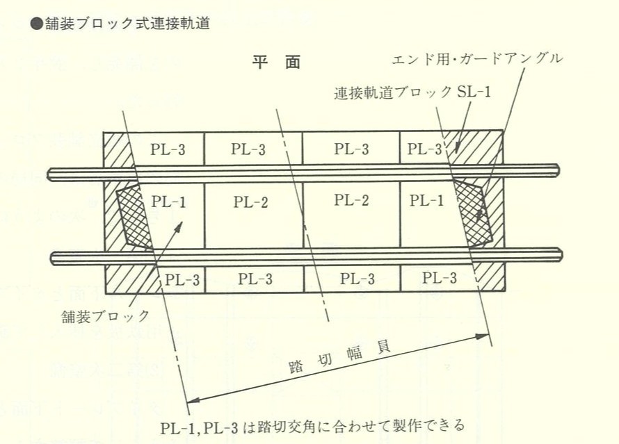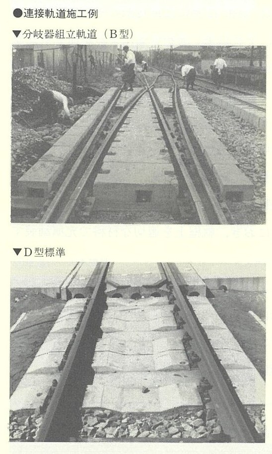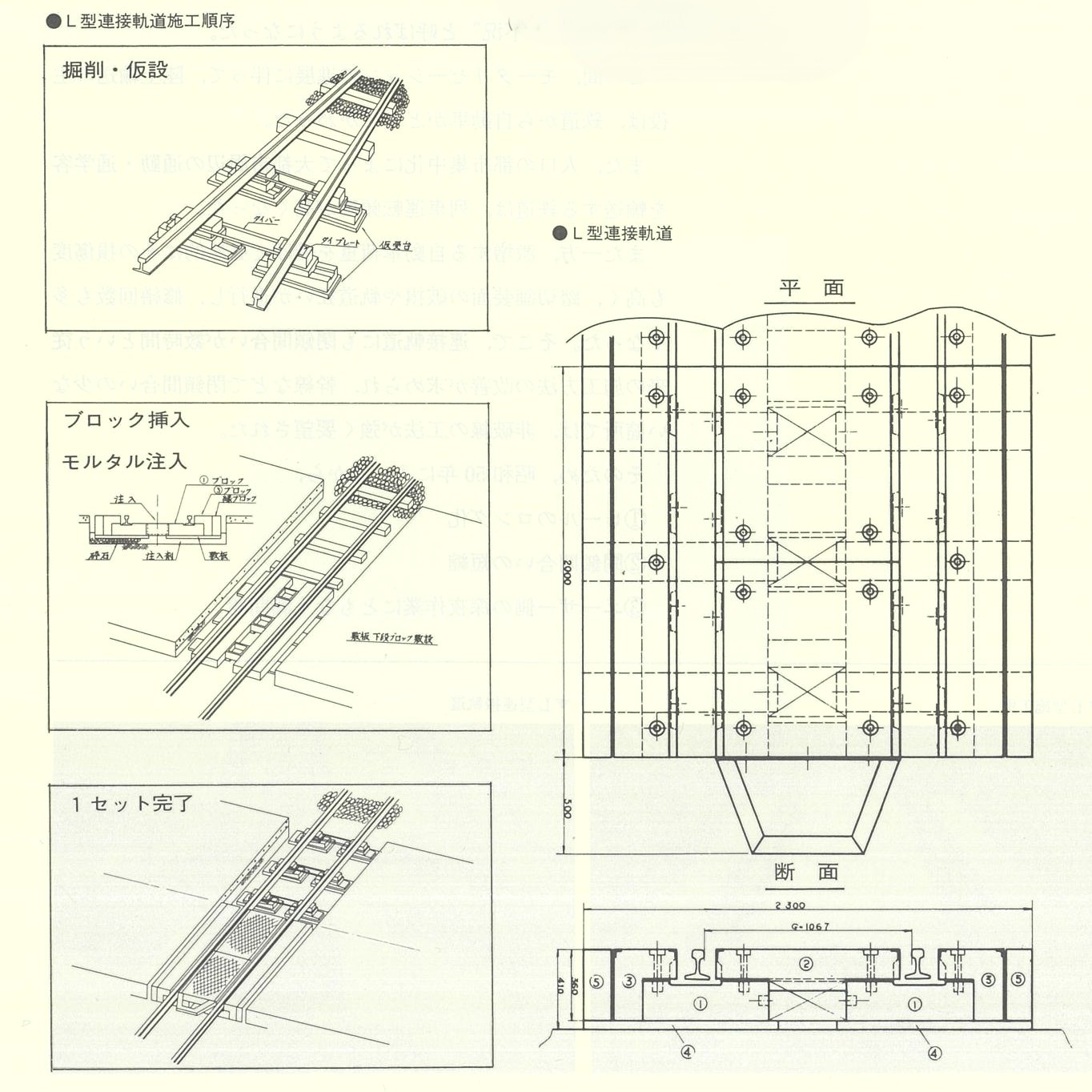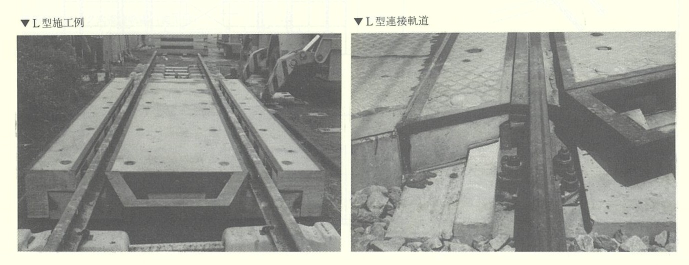 等に対処すべき工法の開発研究を開始し51年に至って完成させた。 2プロック式のタテ型コンクリート枕木の上にレールを敷いて締結し、横からL型のプロックでそれらを抱えこんで緊締するこの「L型連接軌道」の特長は次の通りであった。