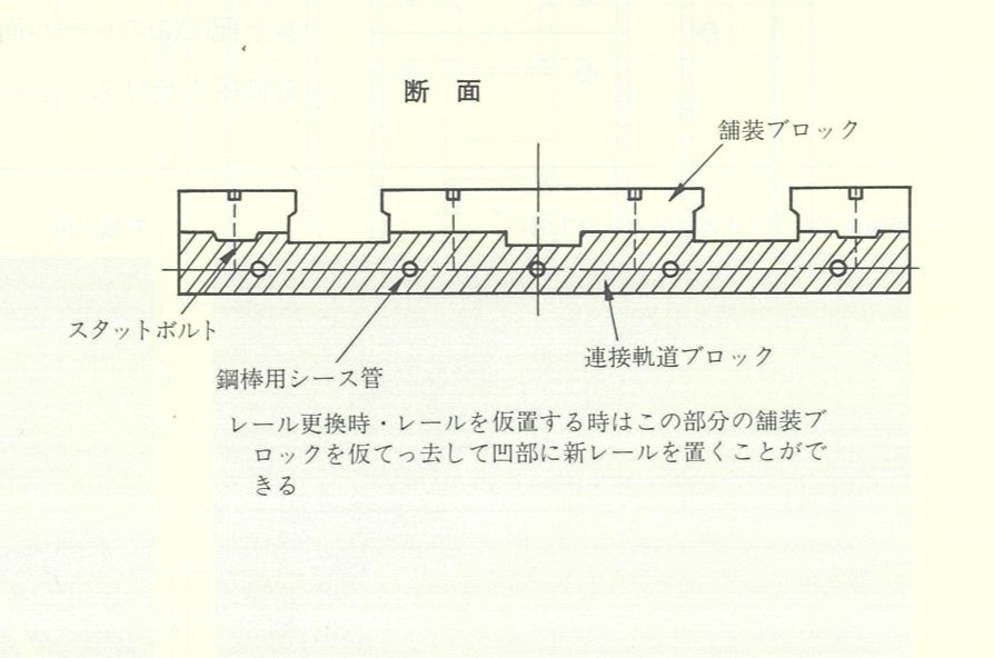 昭和50年代に入って、先の施工法の改善とは別に、もう1つの改善がもとめられた。それは、軌道部分と舗装部分とが一体であるため、路床沈下を起こした場合は全面てっ去しかありえないという条件の改善であった。