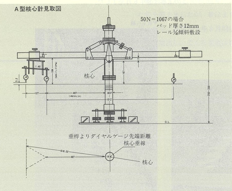 軌道核心工法とは、軌道敷設時の検測項数を最も単純化するために直線、勾配、曲線各部を通じ、遣り方の規正と基準点や原点の移程を核心計によって機械的に容易にしかも正確に知るものであった。すなわち、軌道核心を旋回軸とした直交水準梓をもって、任意の傾度と核心からの位置とが同時検測できる計器(核心計)により軌道の軌間、水準、通り、高低、カント、スラック、勾配を設定するものである。