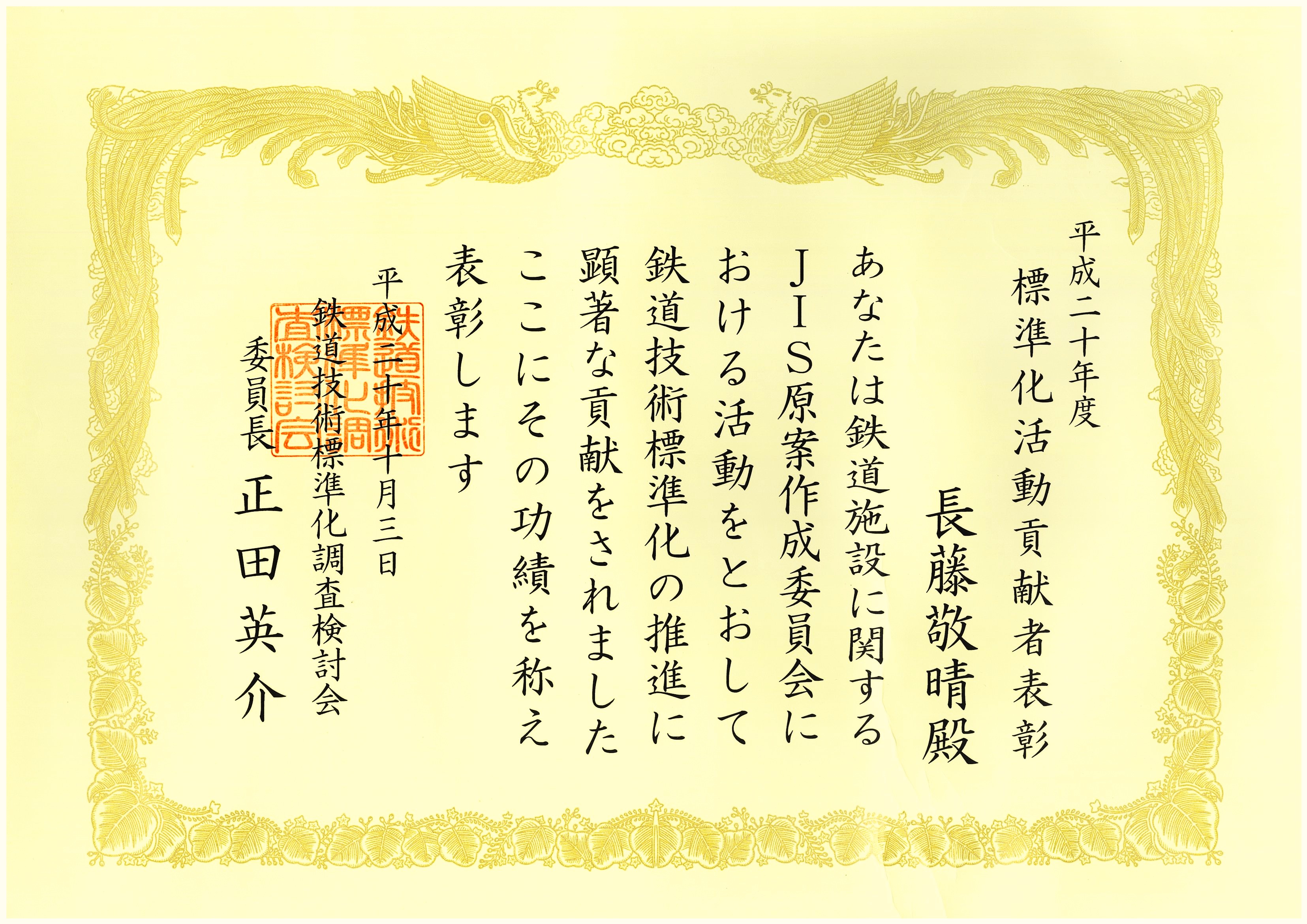 長藤敬晴「平成20年度標準化活動貢献者表彰」受賞
