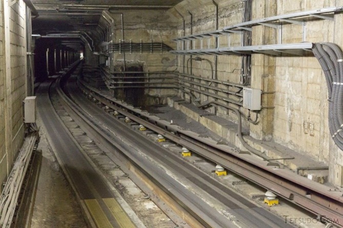 電気の供給は第三軌条方式で上の写真を見ると軌道の右壁側に第三軌条が写っています。