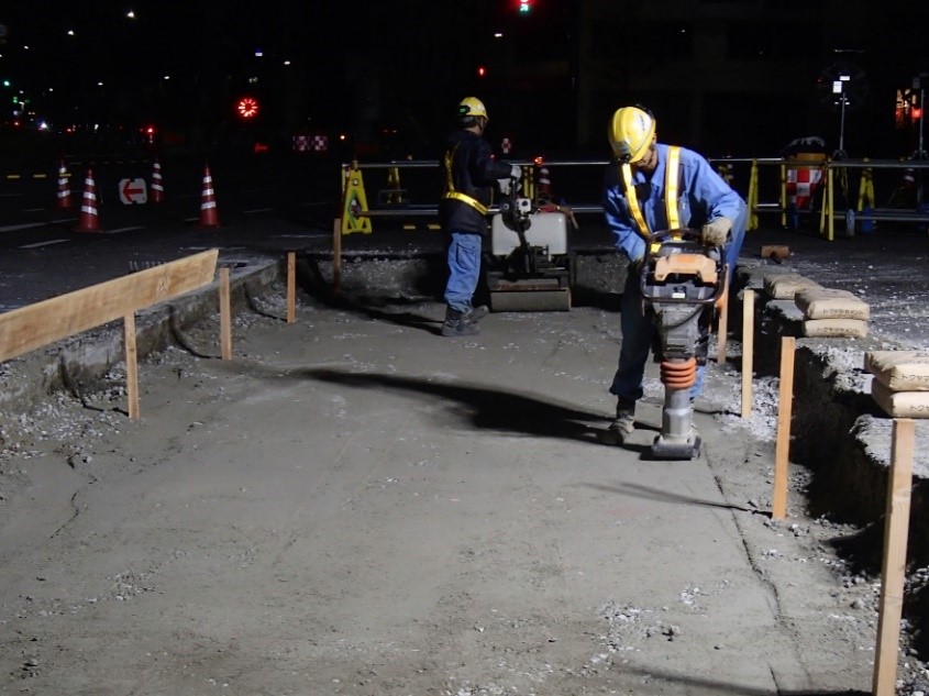 所定の深さで掘削後、下層路盤をタンピングランマー、小型転圧ローラー等で転圧を行います。