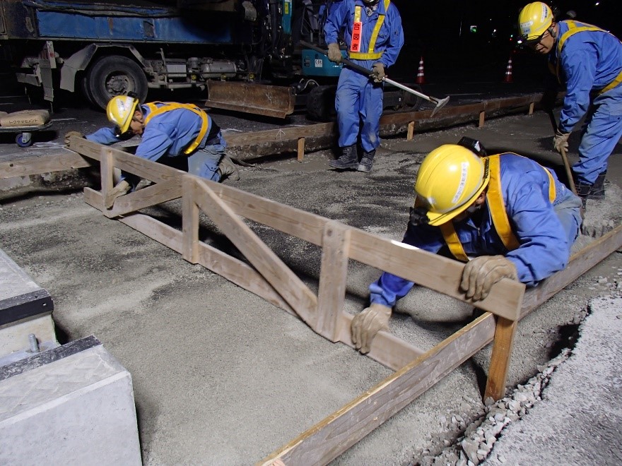 上層路盤の上に豆砕石を敷き均します。この上に連接軌道ブロックが敷設されるため、表面の平滑性に十分注意して敷き均します。