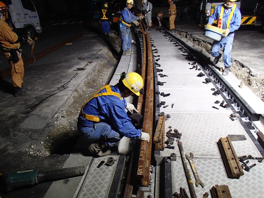 敷設された隣接するブロック同士に段差、通りのズレが無いことを確認後、連 接軌道ブロック内のタイプレート上にレールを設置します。