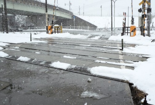 連接舗装ブロック消雪ノズル、散水管等を埋設し、散水により踏切部を消雪します。降雪地帯のスリップ事故を防止し冬季の踏切安全を強力に確保します。