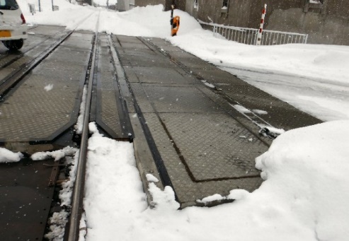 総研型踏切舗装版の表面にゴムを固定し、このゴムの弾性により雪氷の付着を防止します。路面がアイスバーンになりやすい極寒地域の踏切に最適です。またゴムには着色もでき、視野性も向上します。