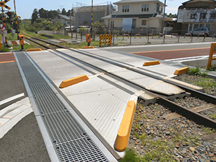 踏切付帯設備として、連接軌道および総研型踏切舗装版および各種踏切に併用敷設することにより踏切取付部の舗装および排水が完全となり耐久性が向上します。