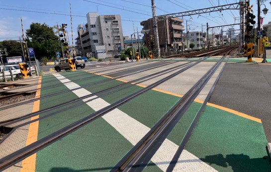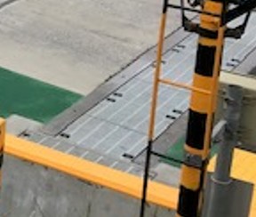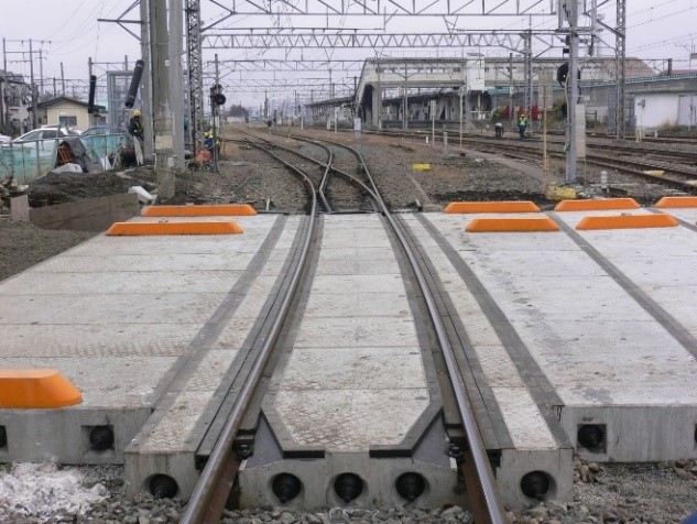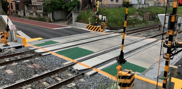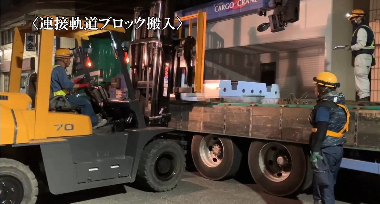 クレーンの使用できない道幅でのフォークリフトを使用した踏切交換工事の事例です。