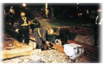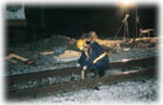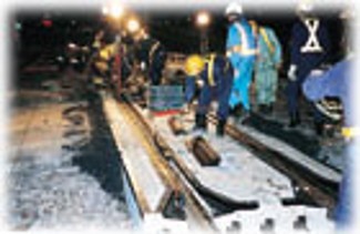 軌道状態を確認し、ブロックの通り整正後、PC鋼棒を挿入し仮締めを行なう。