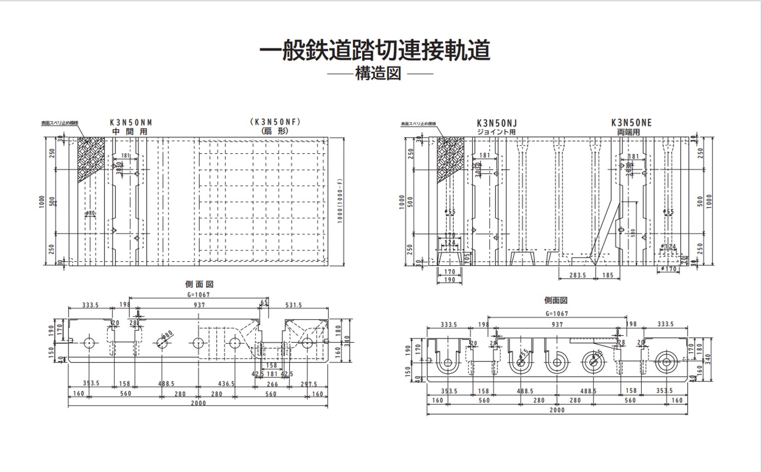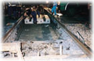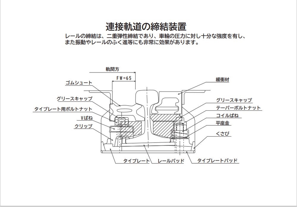 緩衝材、ゴムシュートを取りつけ、軌道を検測して敷設を完了する。