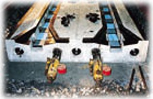 レールを挿入し、タイプレート用ボルトでレールを締結する。軌間、高低、水準、通りを調整し、テーパーボルトを締結する。